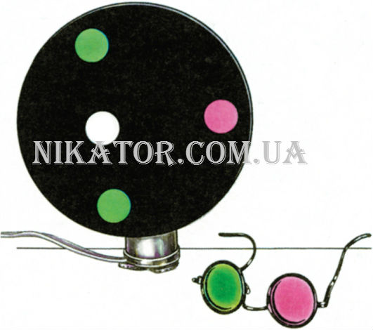 Четырехточечный цветотест располагает двумя зелеными или синими кругами, одним красным и одним белым. Пациент смотрит через очки – красный фильтр справа и зеленый либо синий слева. Белый круг видно через оба фильтра, и он будет окрашен в зеленый или красный цвет в зависимости от того, какой глаз ведущий. Если диагностируется монокулярное зрение – видно два красных или три зеленых круга в зависимости от ведущего глаза. Если зрение одновременное – видно пять кругов. Если зрение бинокулярное – четыре круга.