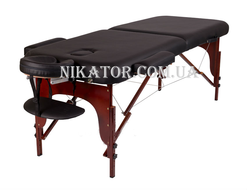 Габариты массажного стола 190см*70см. Амортизационный слой 6 см – мягкий, но в тоже время достаточно упругий, позволяет пациенту комфортно чувствовать себя во время процедуры массажа. Буковые элементы покрыты лаком темного цвета, что придает столу особое изящество.