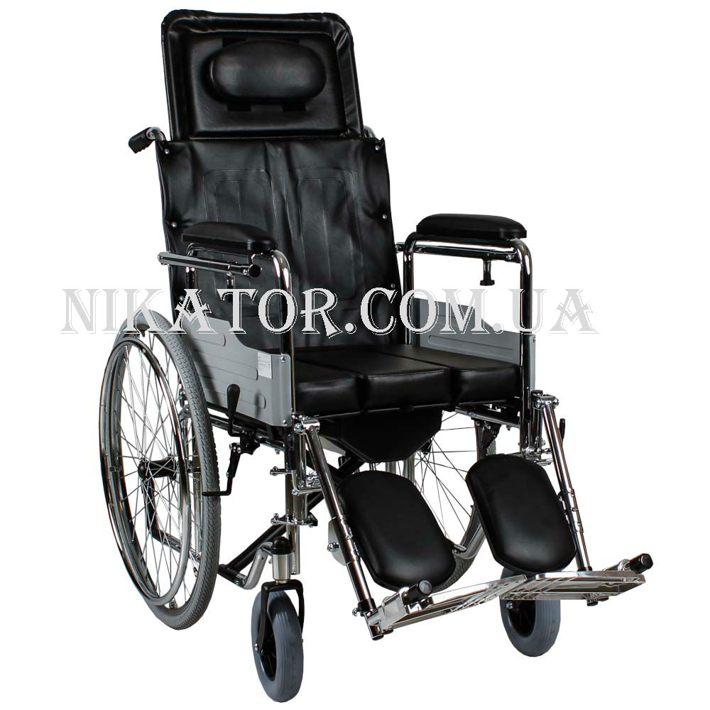 Инвалидная коляска с санитарным оснащением имеет подножки, которые также можно подстраивать под собственные параметры, изменяя угол наклона и высоту. Для голени имеется мягкая опора. Инвалидная коляска оснащена туалетом. Цвет исполнения: метал хром, кожзаменитель черный.