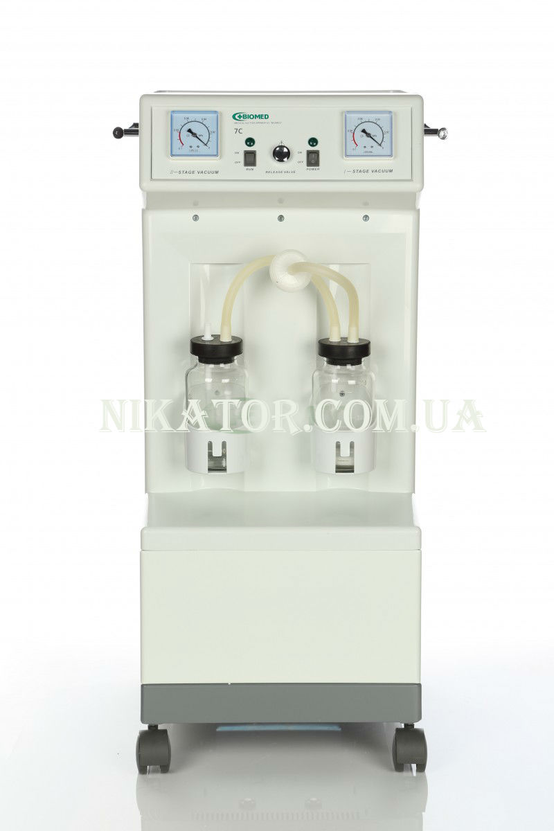 Медицинский аспиратор состоит из насоса, трубопровода, сосуда для аспирации с крышкой и клапаном, что предотвращает обратный заброс аспирированных масс. Использование интуитивно простое: необходимо ввести трубку в места аспирации и включить насос. Емкость аспиратора 2 емкости по 0,5 литра, легко поддаются очистке. Производительность: воздух 15 литров в минуту, жидкость 5. Регулирование вакуума от 0 до 0,09М па. На сосуд нанесена шкала, что позволяет контролировать аспирацию. Питание от стандартной сети. Размеры 444*400*850 мм