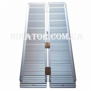 Пандус для инвалидной коляски выполнен из стали. Длина 153 см и ширина 71 см. Максимальная нагрузка на рампу 300 кг, что позволяет использовать его для активных колясок, электрических колясок и скутеров. Вес пандуса 13.34 кг. Позволяет преодолевать высокие барьеры, препятствует соскальзыванию. Можно использовать для спуска с автомобиля или общественного транспорта. Для дополнительной безопасности рампа имеет ограничительные борты. Конструкция складная.