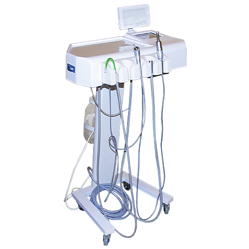 В базовую комплектацию модели входят: микродвигатель с максимальной частотой вращения 35000 оборотов в минуту и мощностью 96 Вт, 3-х функциональный пистолет (вода, воздух, спрей), автономный слюноотсос, один турбинный выход М4, свободный держатель для дополнительной комплектации (пьезоскалер, фотополимерная лампа, диатермокоагулятор и прочее.)