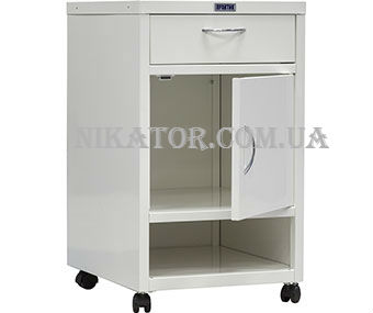 Тумба медицинская МД ТП-1 имеет толщину корпуса в 0,6 мм, а толщину двери 0,7 мм. Снабжена ящиком и полочками, одна из них прикрывается дверкой.
