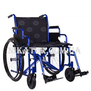 Задние  колеса -  Ø 24’’ (600 мм), оснащены  алюминиевыми ручными обручами, передние колеса поворотные Ø 8’’ (200 мм), вилка усилена. Подлокотники откидные, легко снимаются. Спинка и сидение коляски выполнены из специального черного нейлона, который не нуждается в  специальном уходе и легко моется. Подножки легко снимаются и не препятствуют посадке в коляску, регулируются по высоте, оснащены ремнями для поддержки пятки,а также иметаллической подножкой для поддержания стопы.